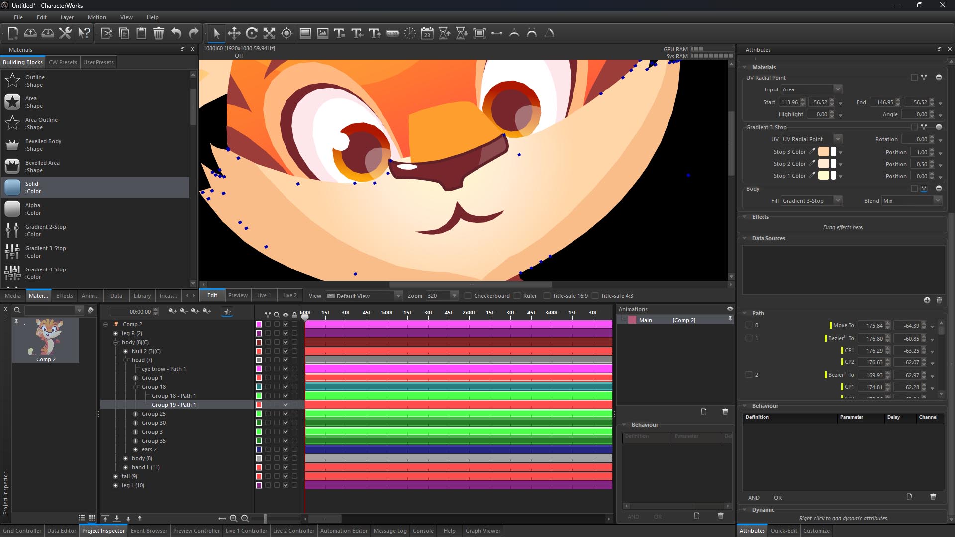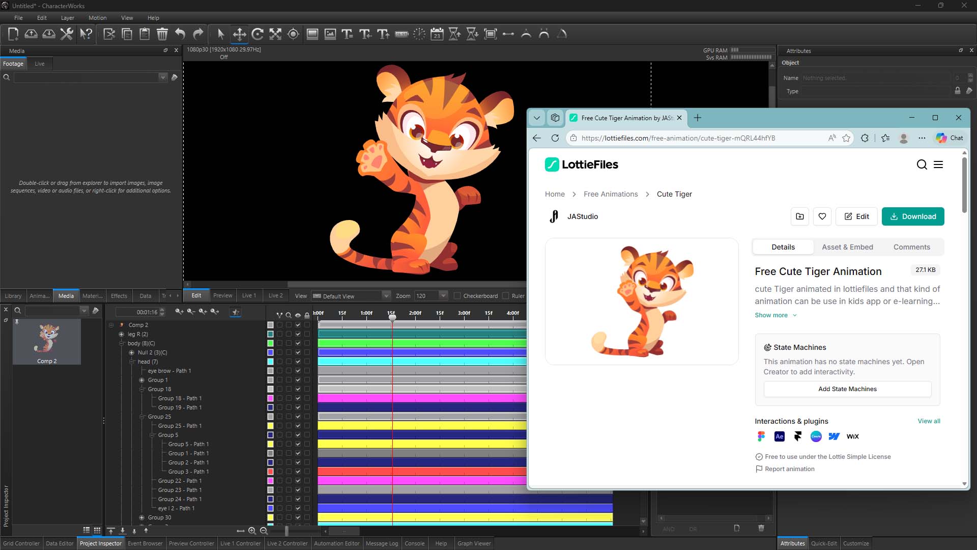 ** As not all Lottie features are currently supported, there is no guarantee that the exact same look of the Lottie content will be reproduced in CharacterWorks. This feature is intended to provide a good starting point for new CharacterWorks projects, from where the desired results can be achieved with further editing.